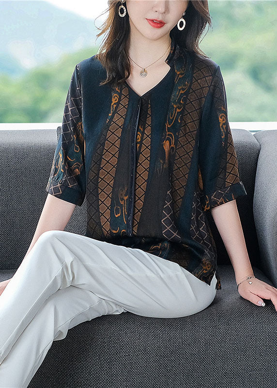 Fine Navy V Neck Print Patchwork Silk Shirt Summer