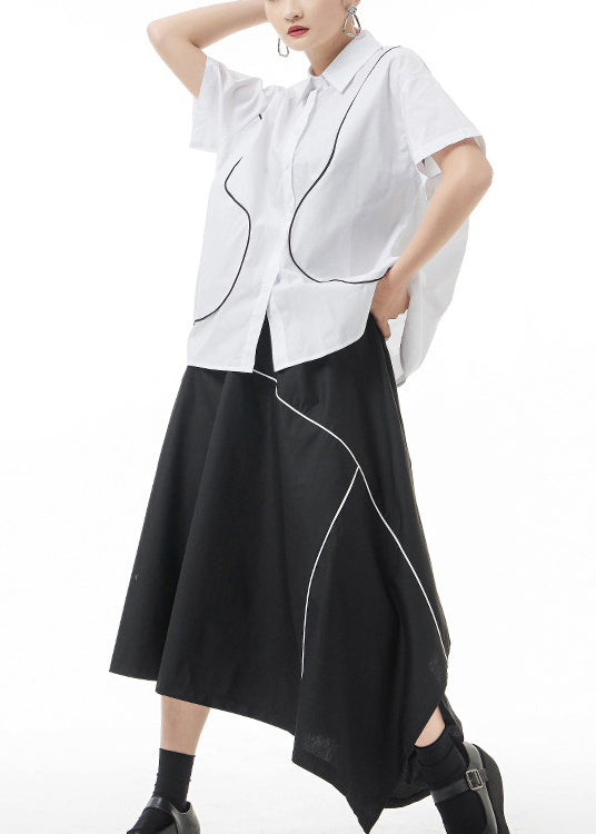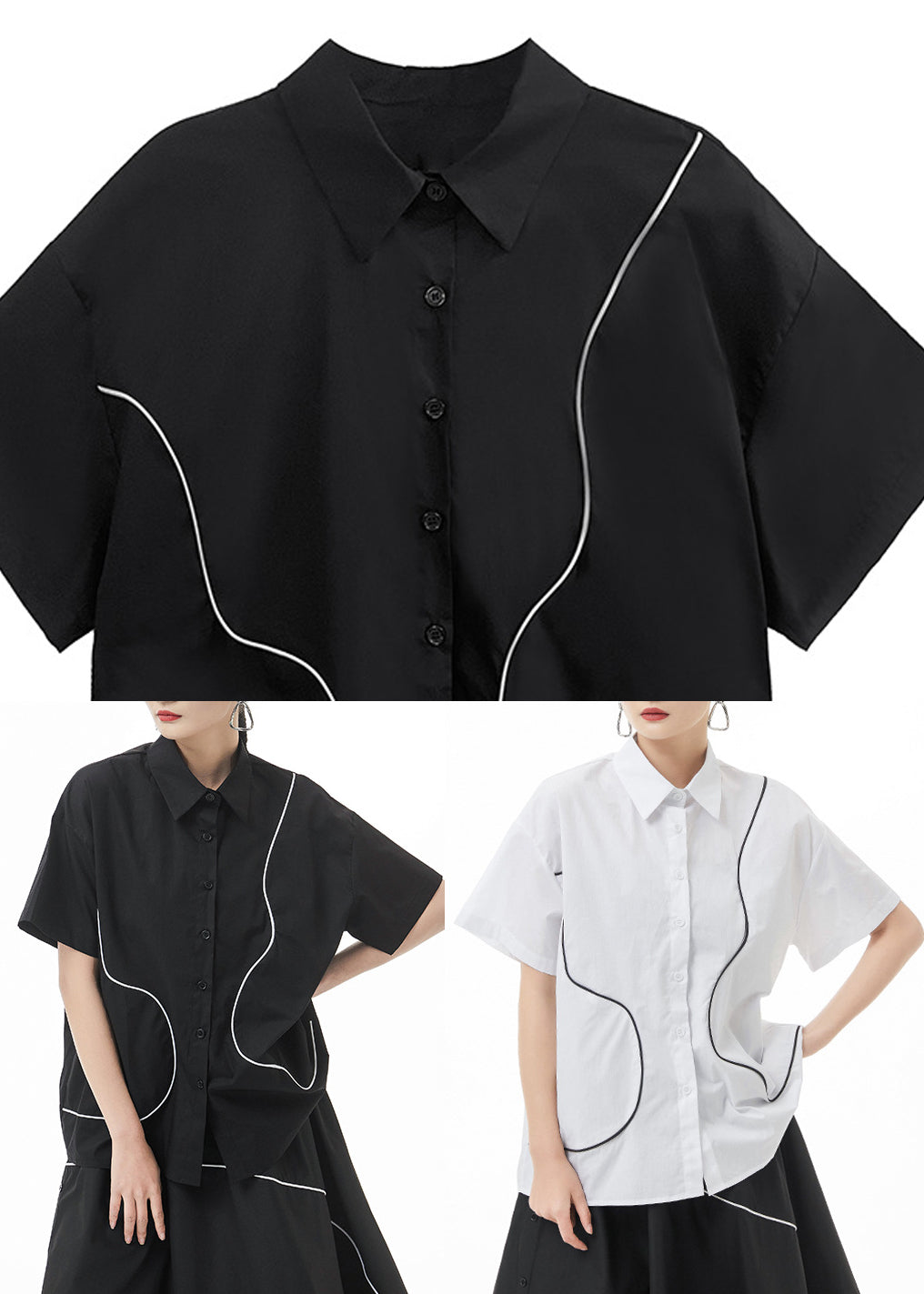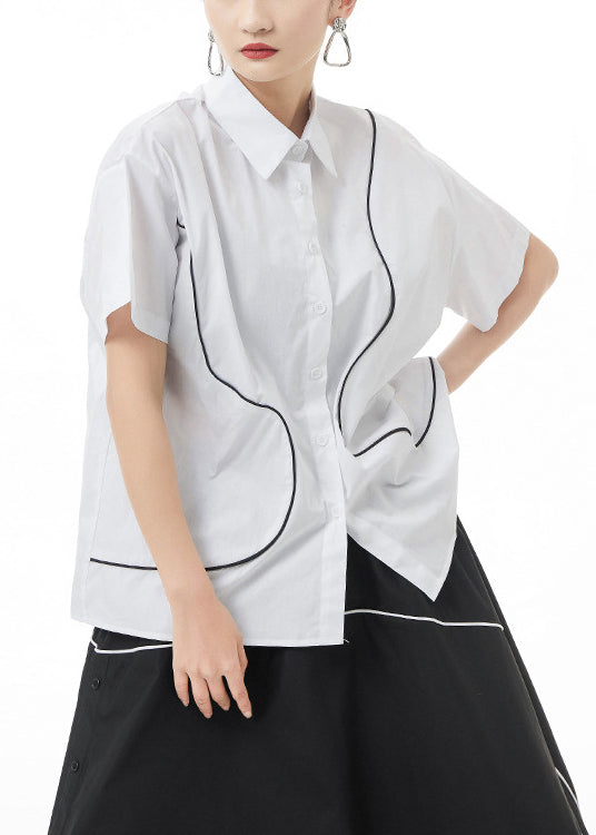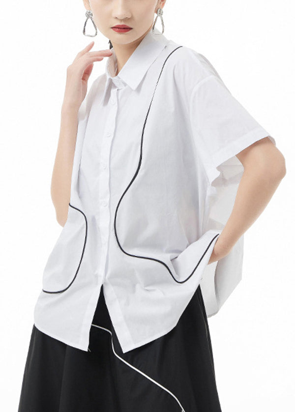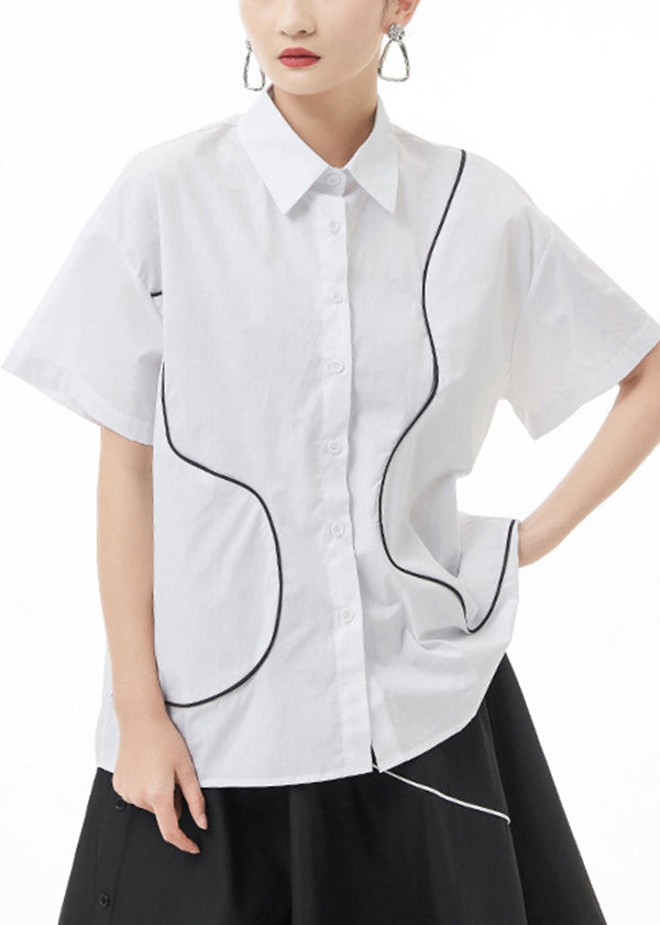 French White Peter Pan Collar Line Cotton Shirt Top Short Sleeve