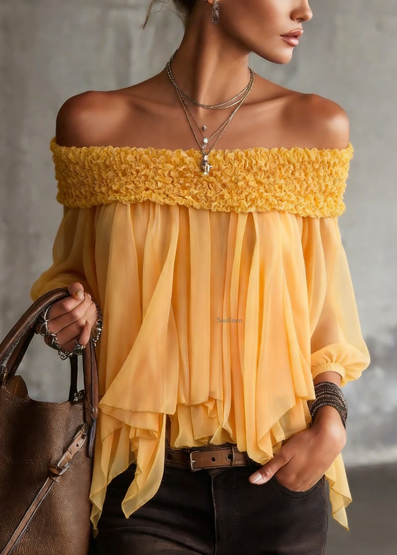 Stylish Yellow Asymmetrical Slash Neck Chiffon Blouse Tops Spring