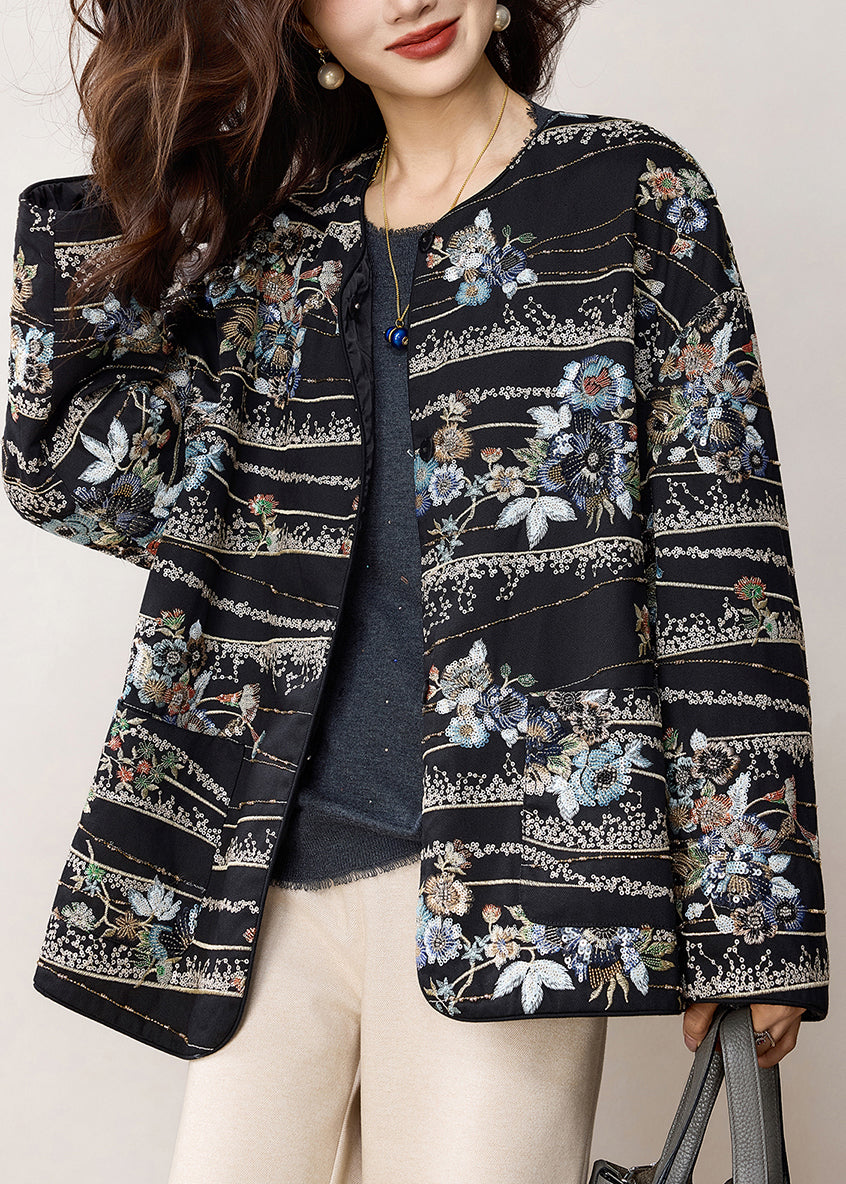 Chinese Style Black Embroidered Sequins Cotton Coats Spring