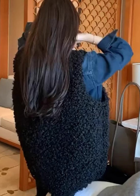 Chic Black Oversized Faux Fur Vests And Denim Shirts Two Pieces Set Winter