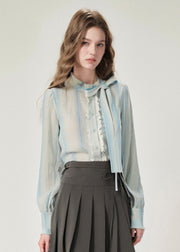 Fitted Blue Gradient Striped Bow Patchwork Cotton Shirts Fall