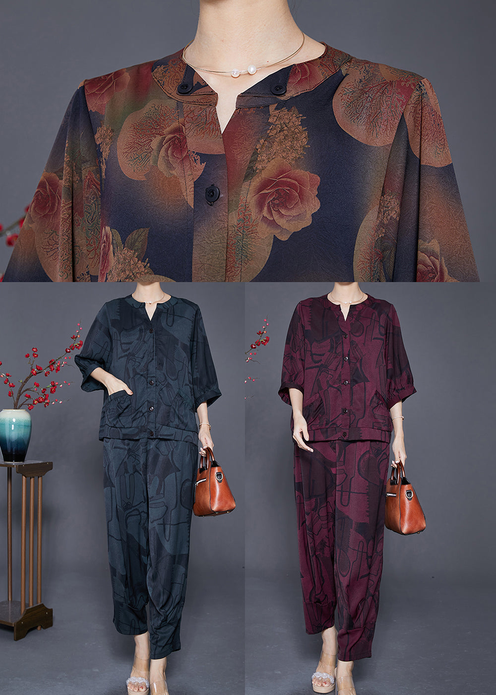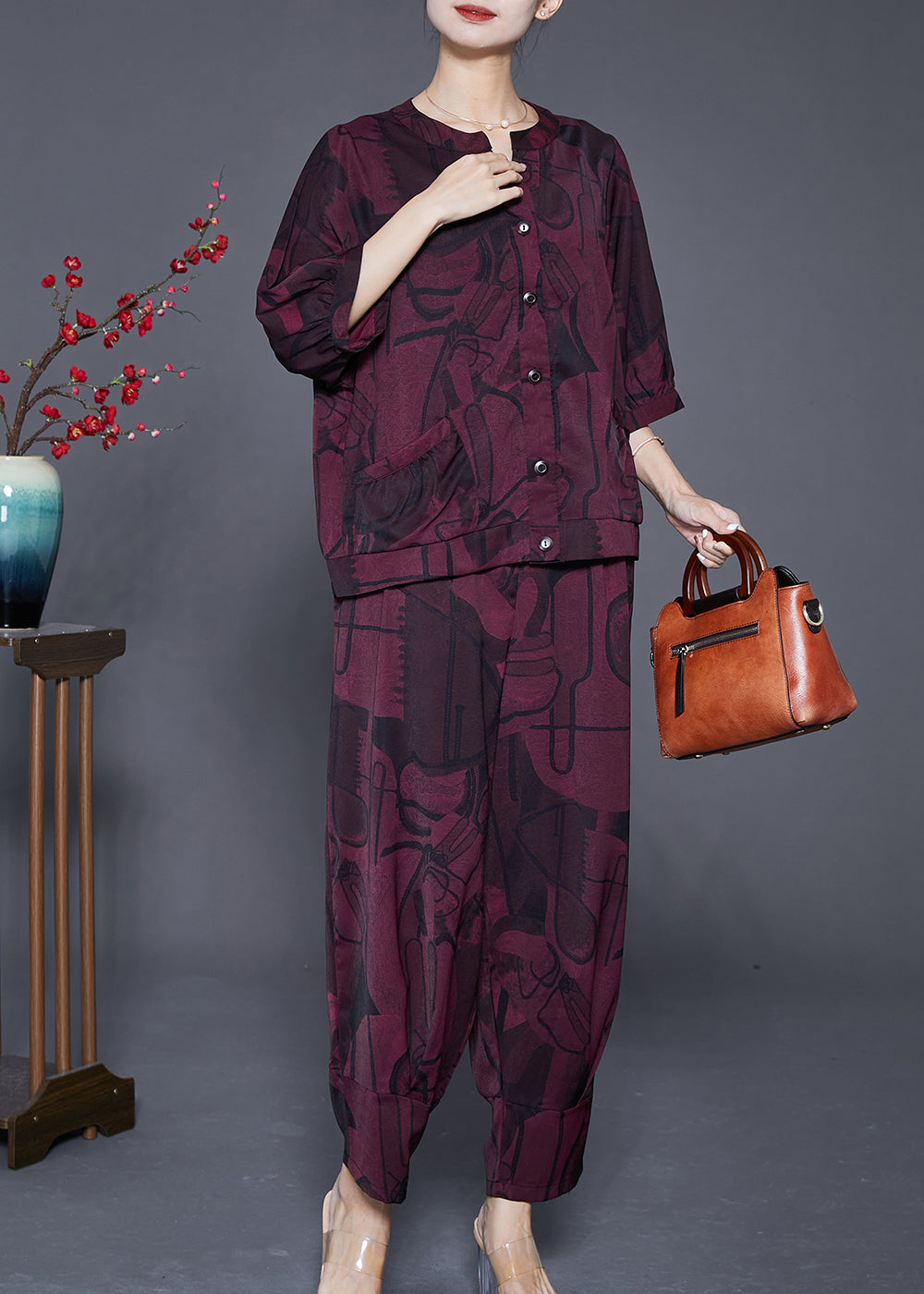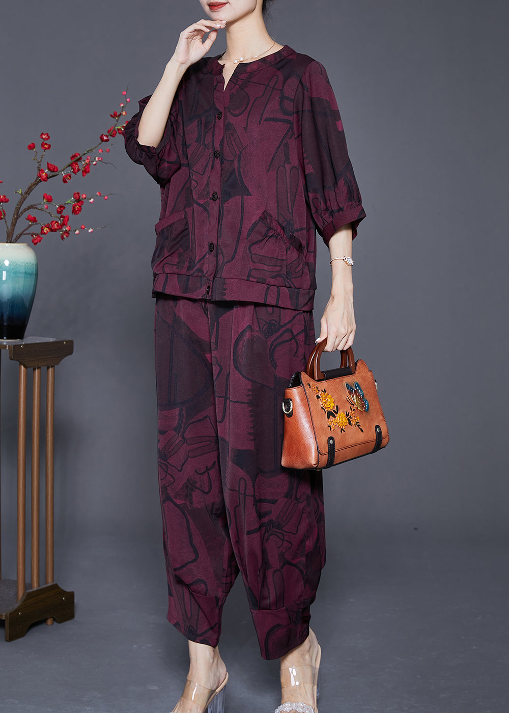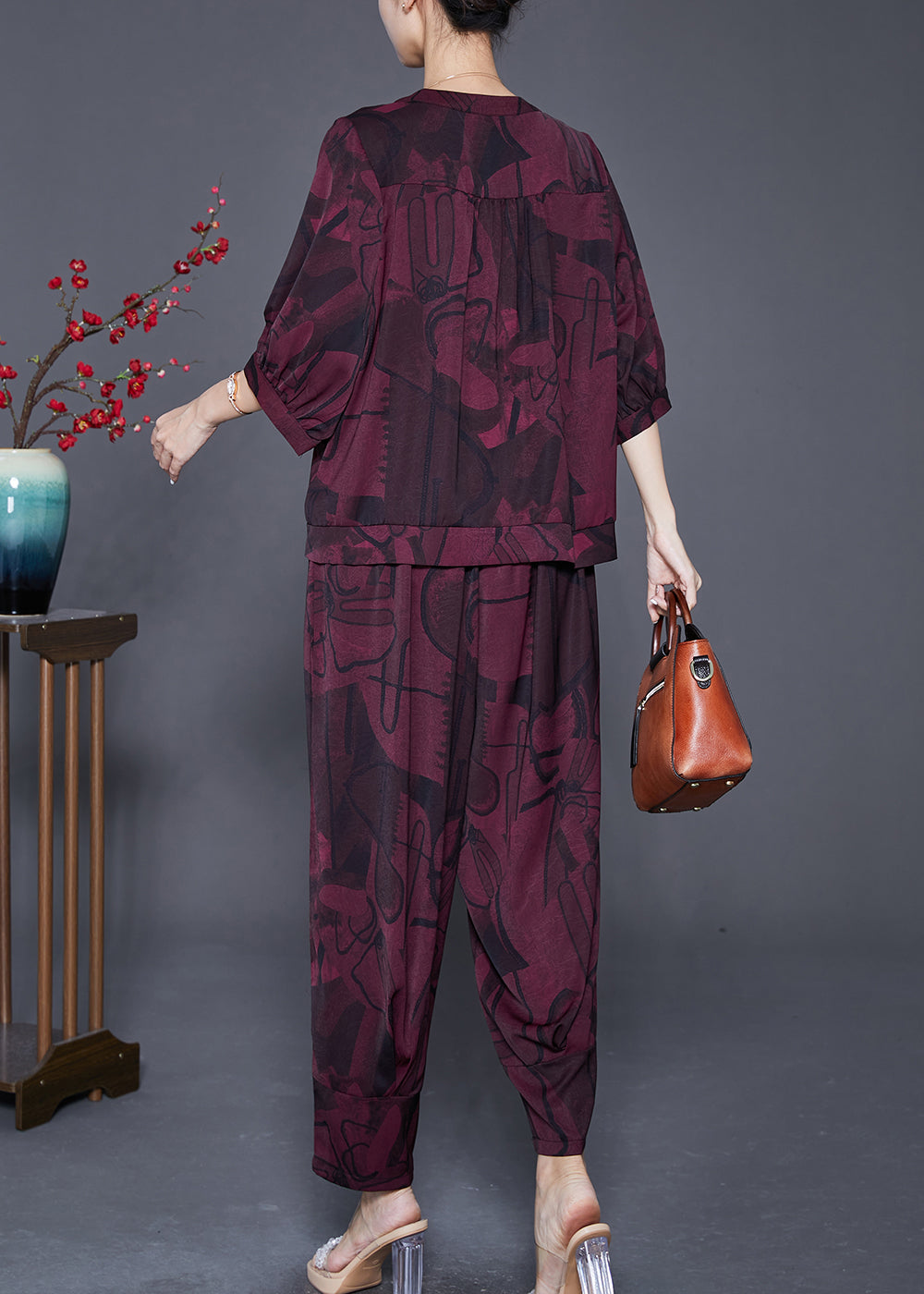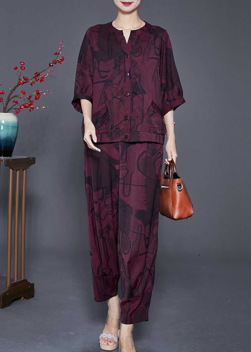 Fashion Dark Purple Oversized Print Silk Two Piece Set Outfits Summer