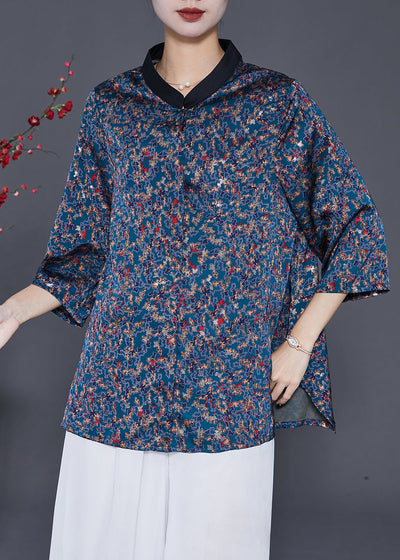 Simple Navy Oversized Print Silk Blouse Top Bracelet Sleeve