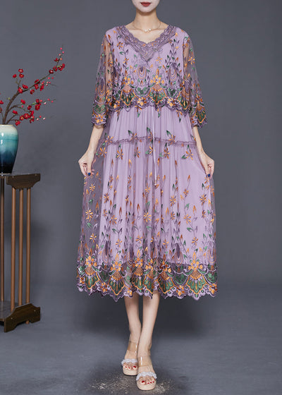 Purple Tulle Long Dress Hooded Embroideried Summer