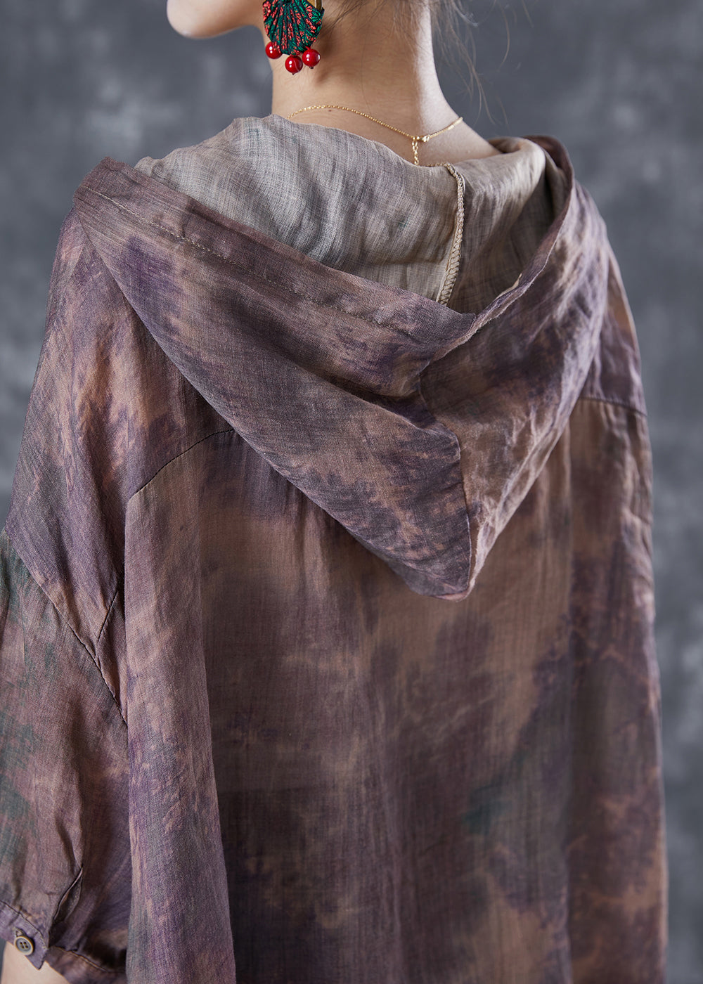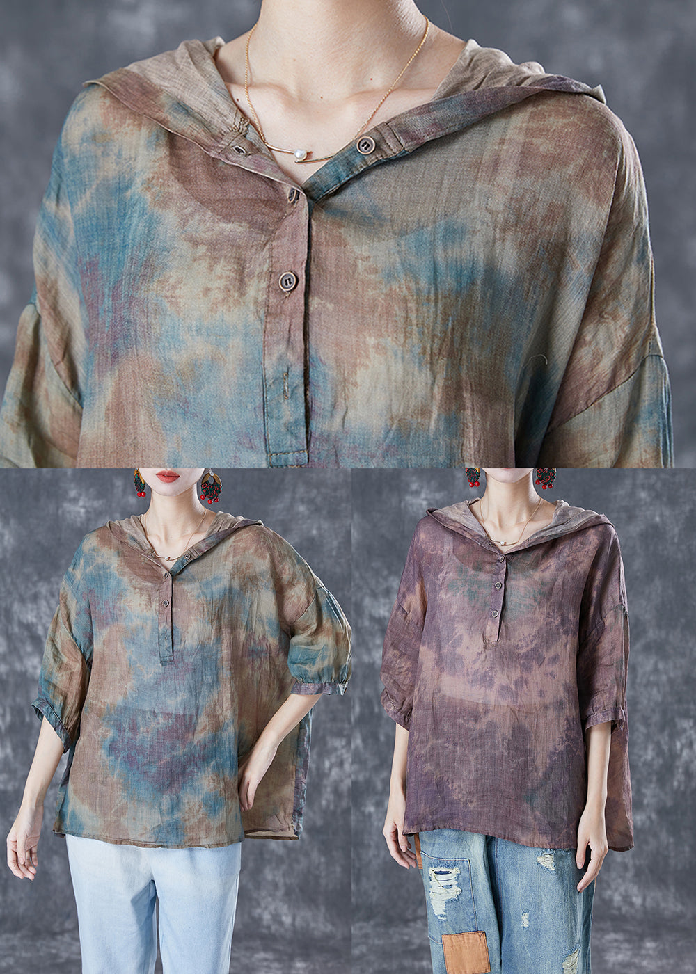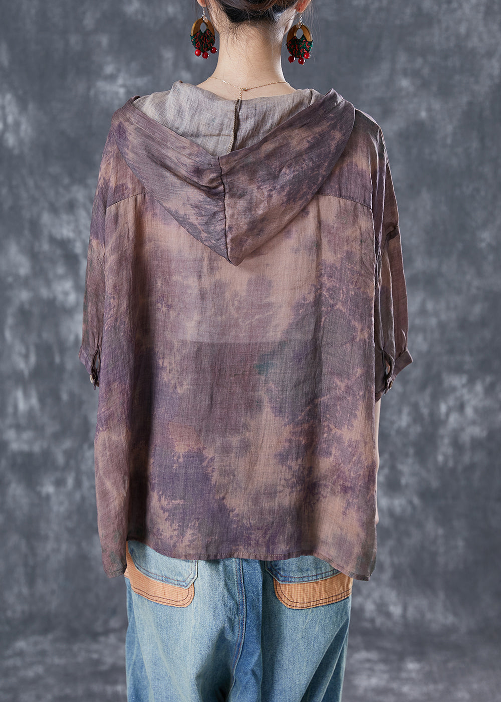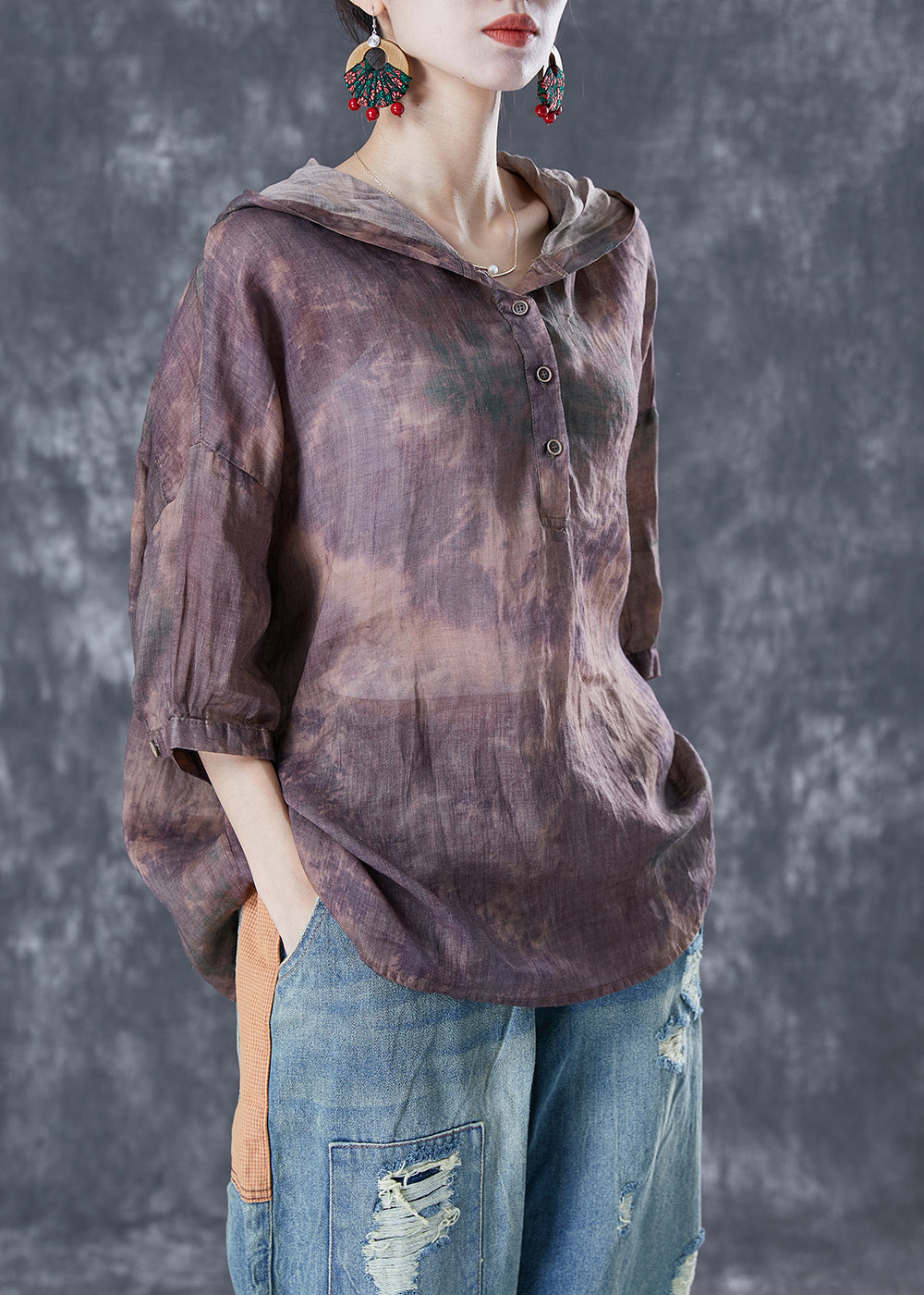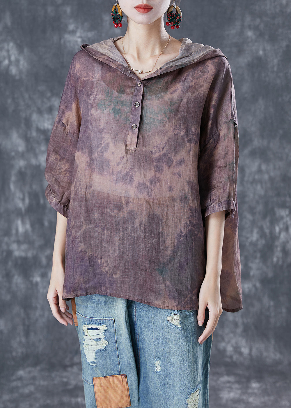Purple Tie Dye Linen Shirt Top Hooded Oversized Bracelet Sleeve