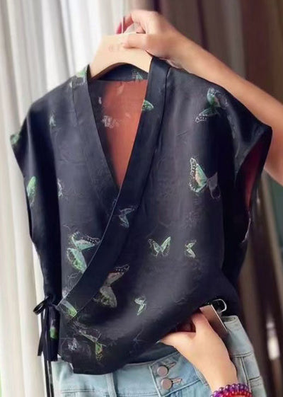 French Black V Neck Print Lace Up Silk Tank Sleeveless