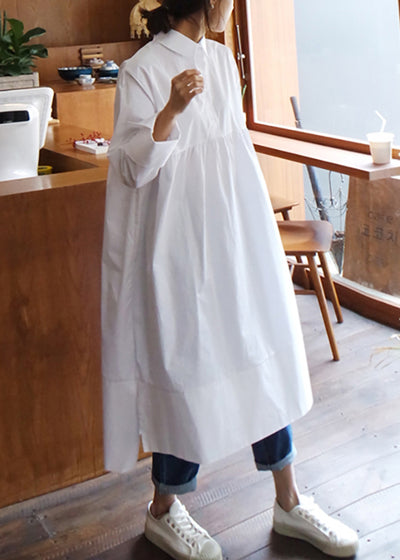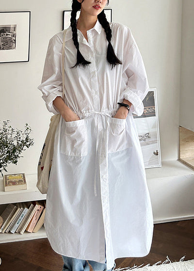 Loose White Pockets Cinched Cotton Shirts Dresses Fall
