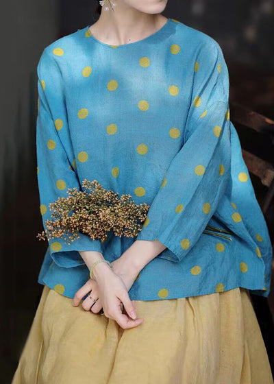 Plus Size Blue O Neck Button Dot Linen Shirt Fall