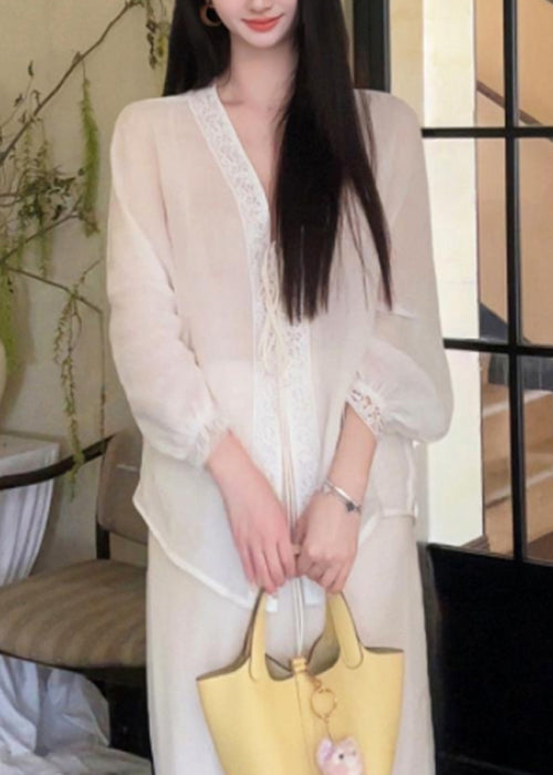Loose Blue V Neck Lace Up Cotton Blouse Batwing Sleeve