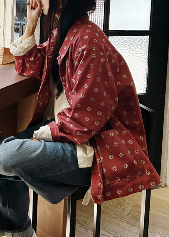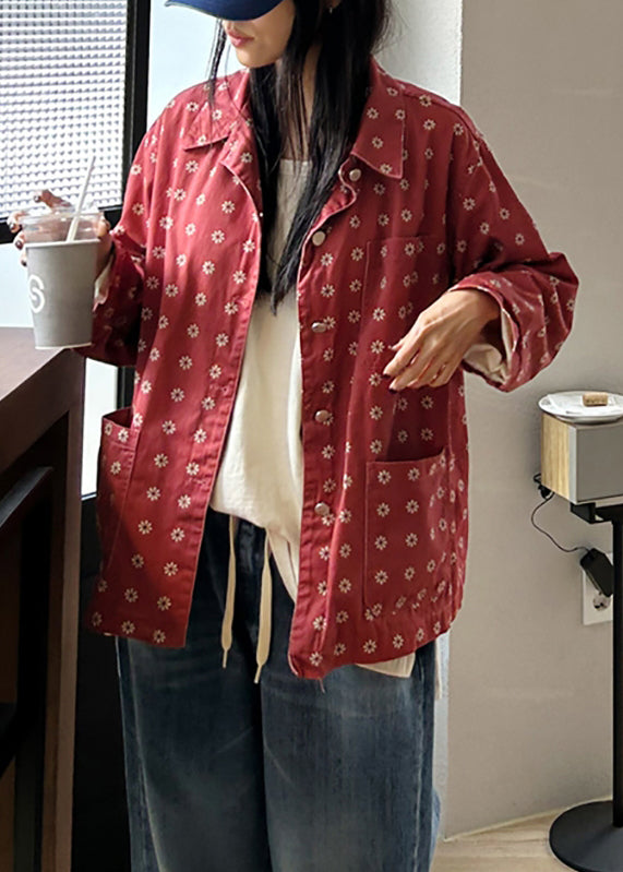 Red Button Pockets Cotton Coats Peter Pan Collar