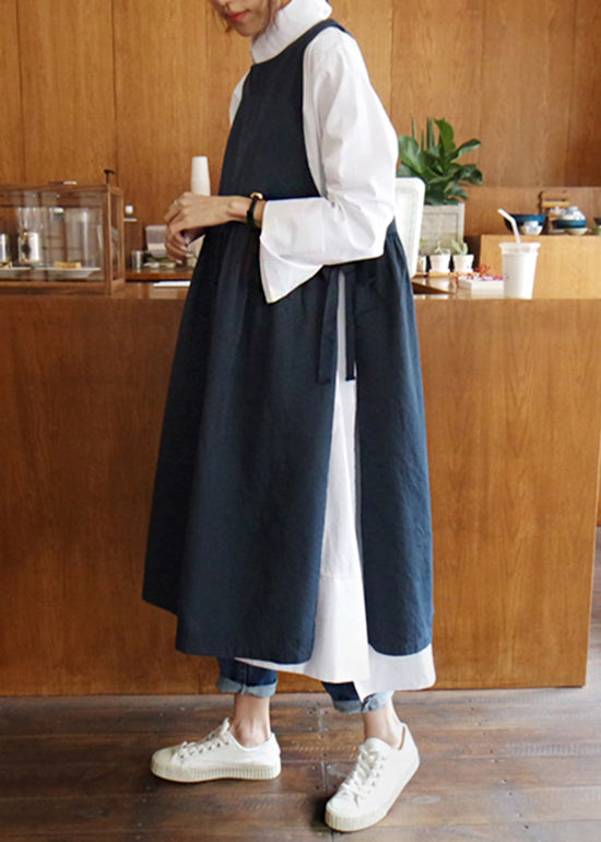 Simple Navy O Neck Lace Up Side Open Cotton Tank Dress Sleeveless