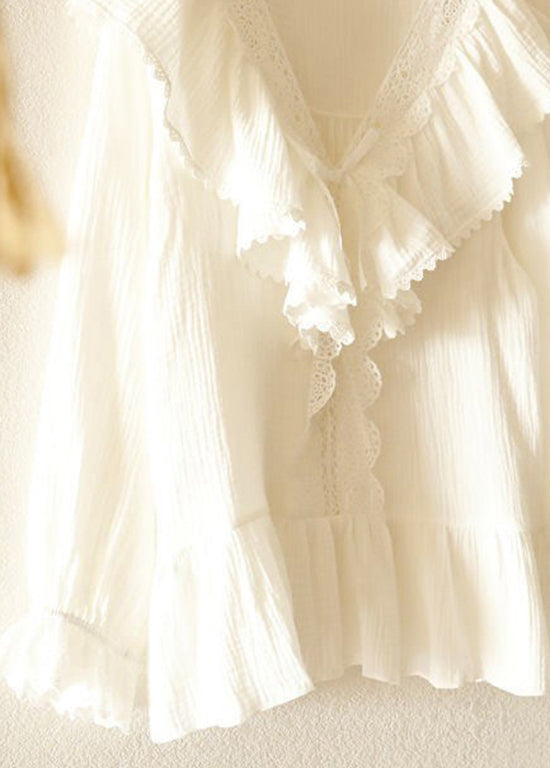 Women White V Neck Patchwork Cotton Pajamas Two Pieces Set Fall