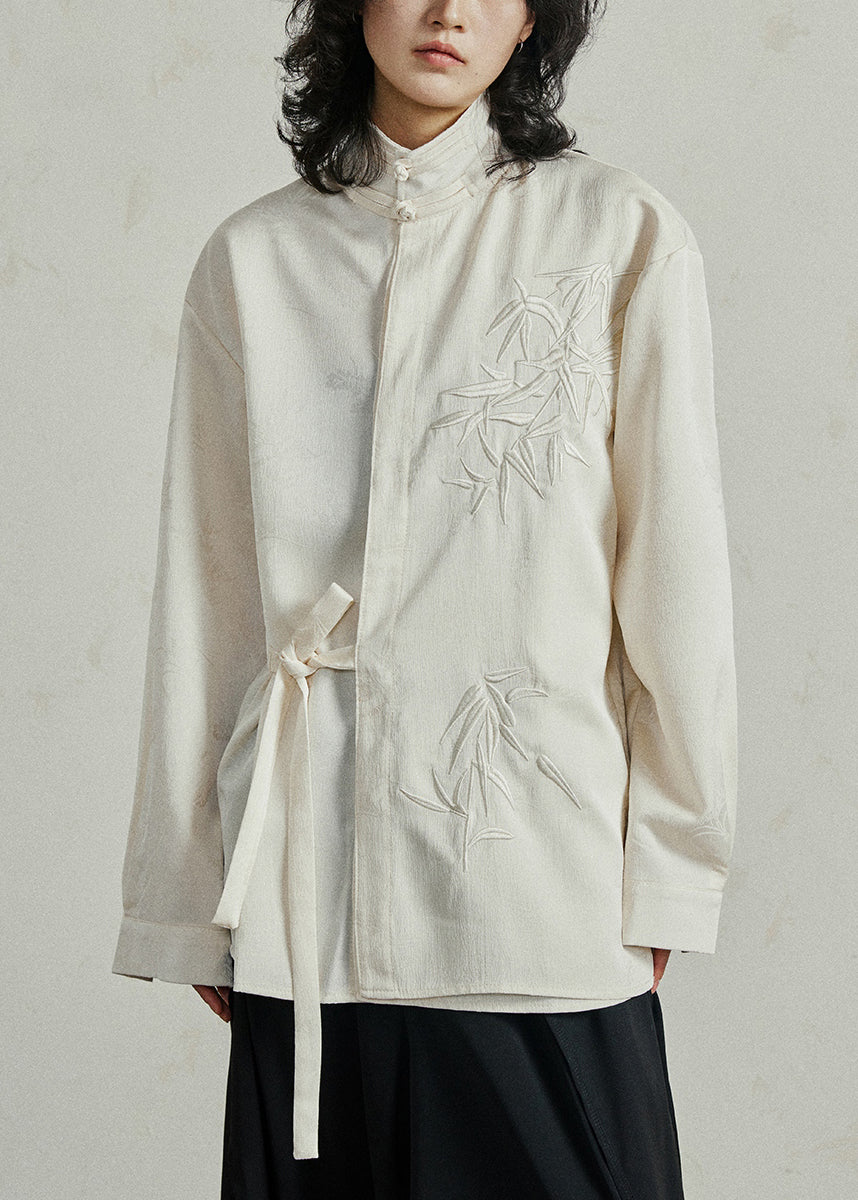 Chinese Style Beige Stand Collar Button Shirt Fall
