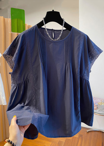 Loose Navy O Neck Hollow Out Cotton Shirt Summer