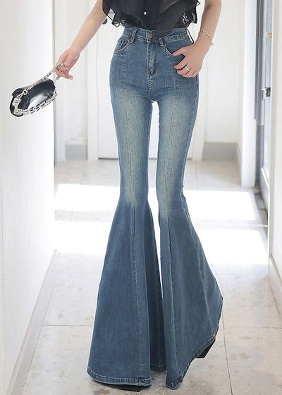 Stylish Blue Pockets Slim Fit Denim Flared Trousers Fall