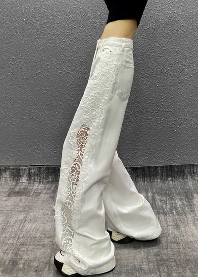 Style White Hollow Out Lace Patchwork Denim Straight Pants Fall