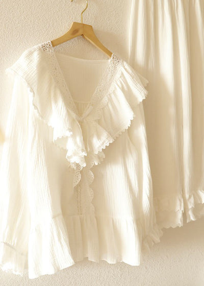 Art White Ruffled Patchwork Lace Cotton Women Pajamas Sets Spring