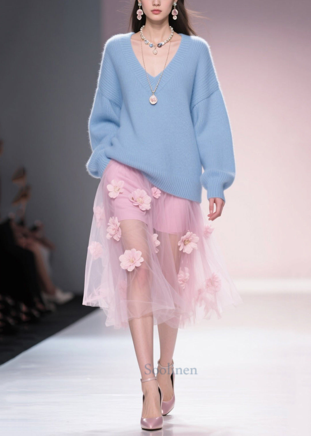 Art Blue V Neck Thick Cozy Sweater Tops Winter