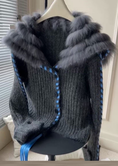 Women Dark Gray Fur Collar Button Cozy Knit Coat Fall