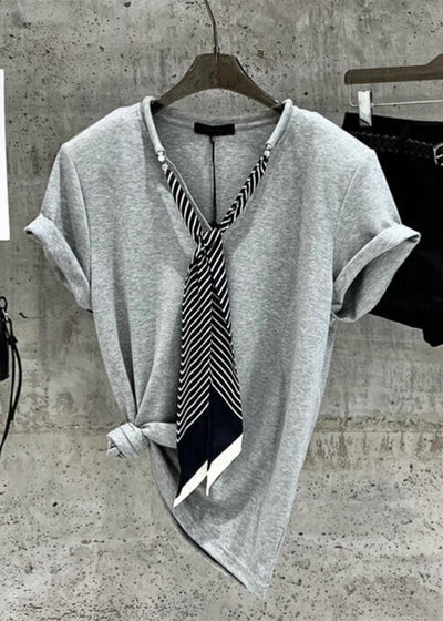 Women Grey Necktie Solid Cotton T Shirts Summer