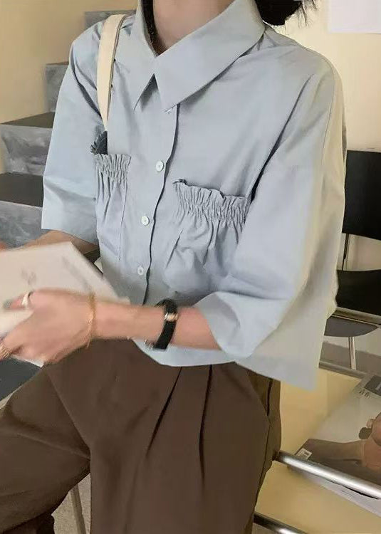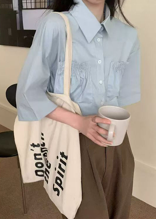 New Blue Peter Pan Collar Button Pockets Cotton Shirt Summer