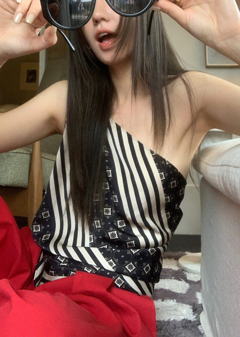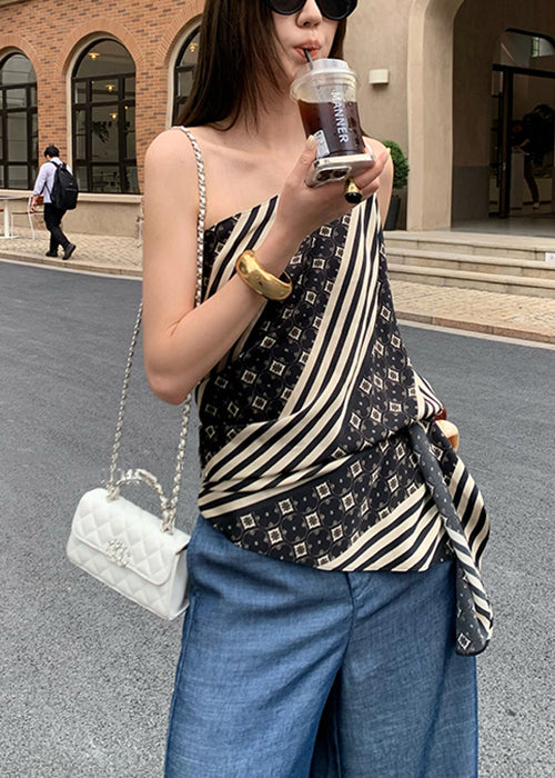 Slim Fit Striped Asymmetrical Print Cotton Tank Sleeveless
