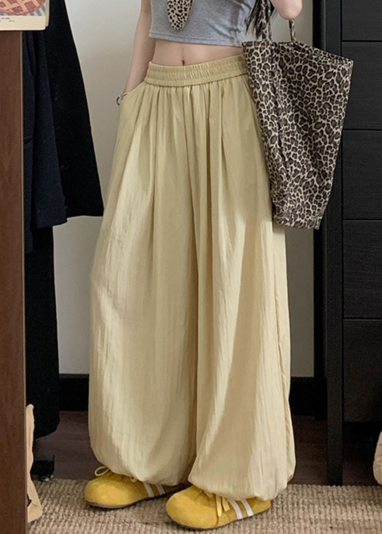 Yellow Solid Loose Cotton Beam Pants Pockets