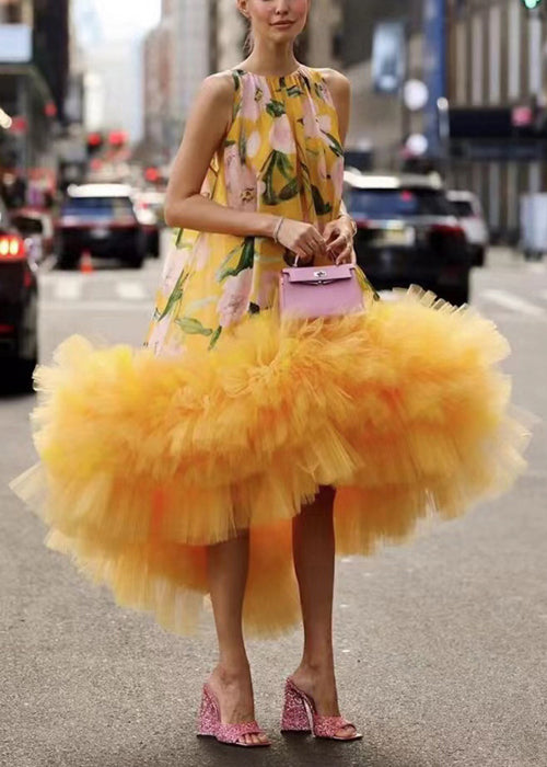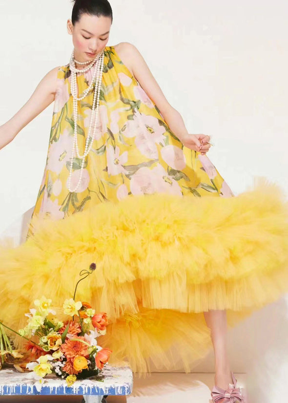 Women Yellow Print Exra Large Hem Party Dress Sleeveless