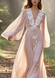 Boutique V Neck Lace Patchwork Chiffon Maxi Dresses Lantern Sleeve