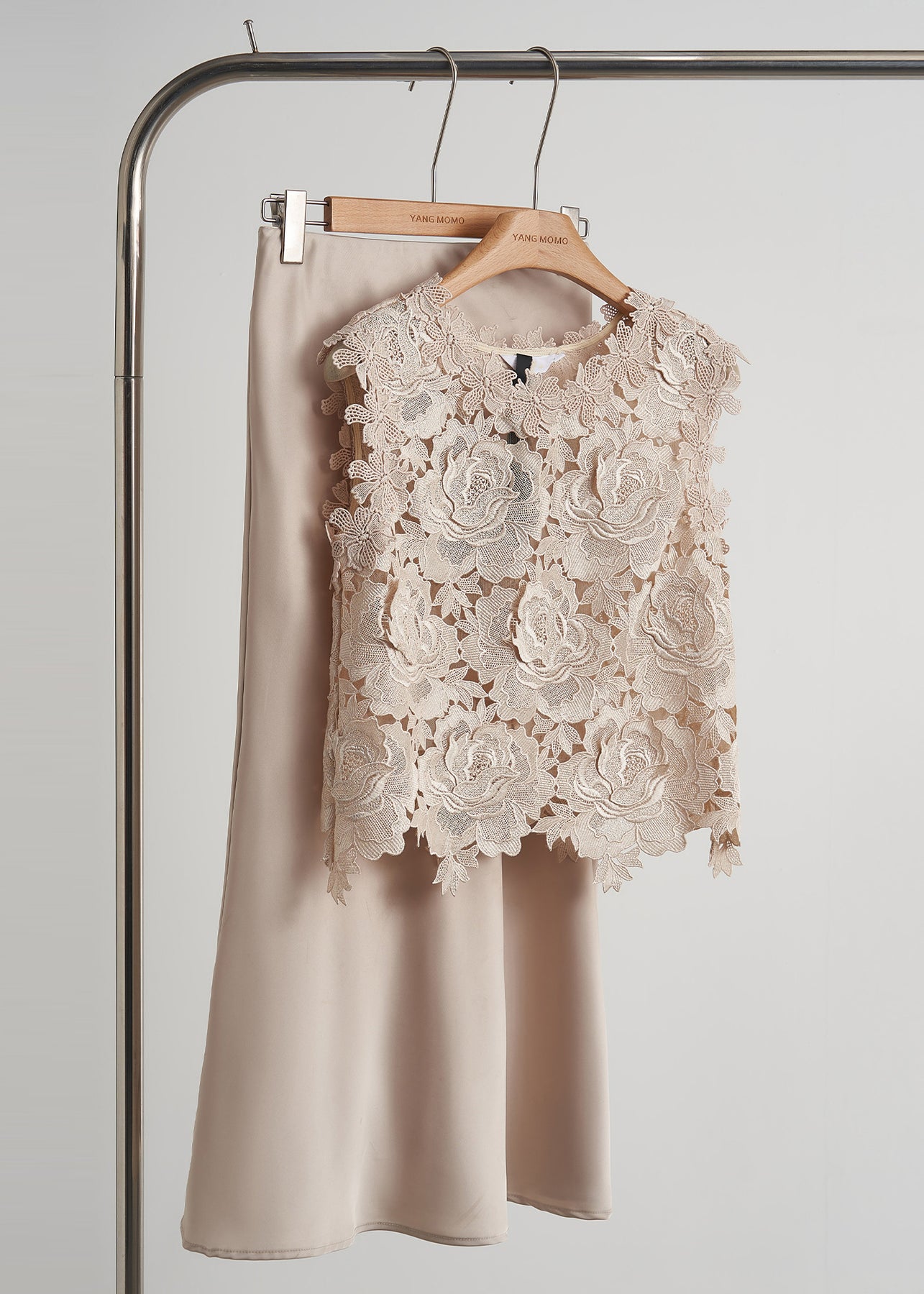 Elegant Apricot Embroidered Floral Lace Vests Sleeveless