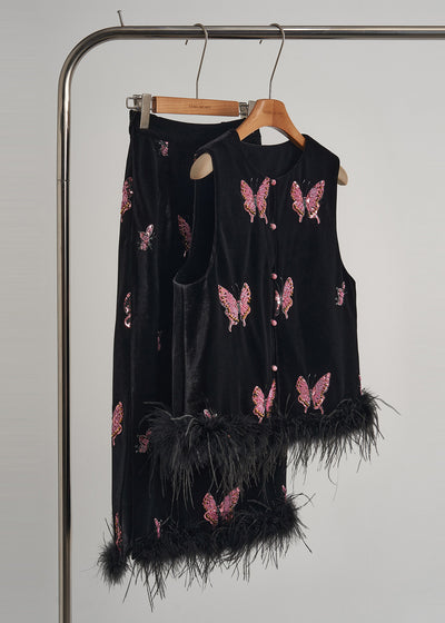 Beautiful Black Butterfly Patchwork Feather Silk Velvet Two Piece Set Women Clothing Fall