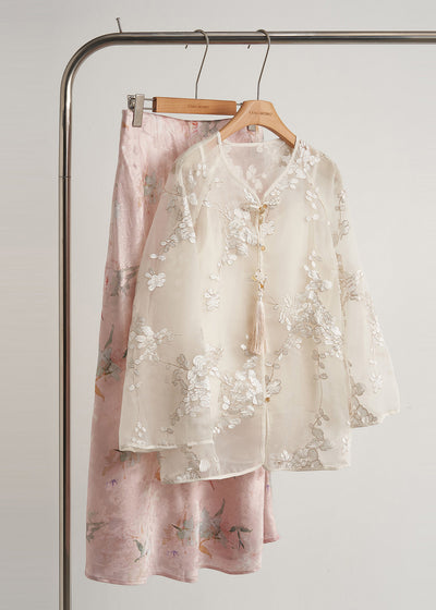 Loose White Embroidered Sequins Silk Shirt Top Bracelet Sleeve