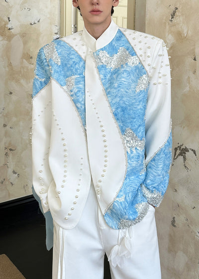 Chic White Nail Bead Sequins Patchwork Cotton Coats Men Fall