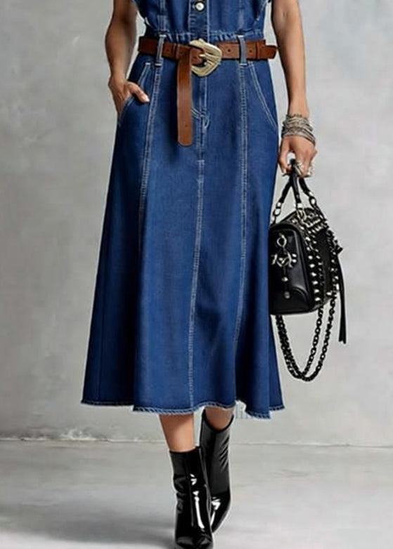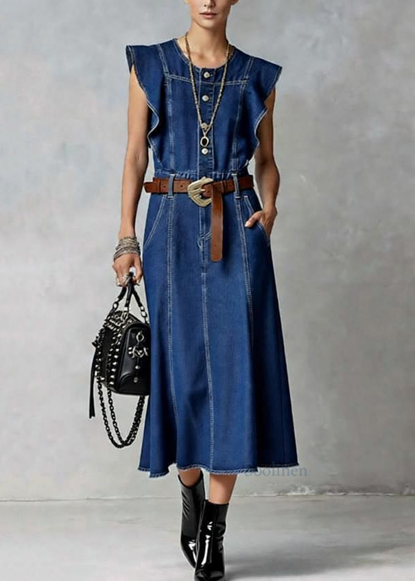 French Denim Blue O-Neck Ruffled Button Summer Maxi Dresses Sleeveless