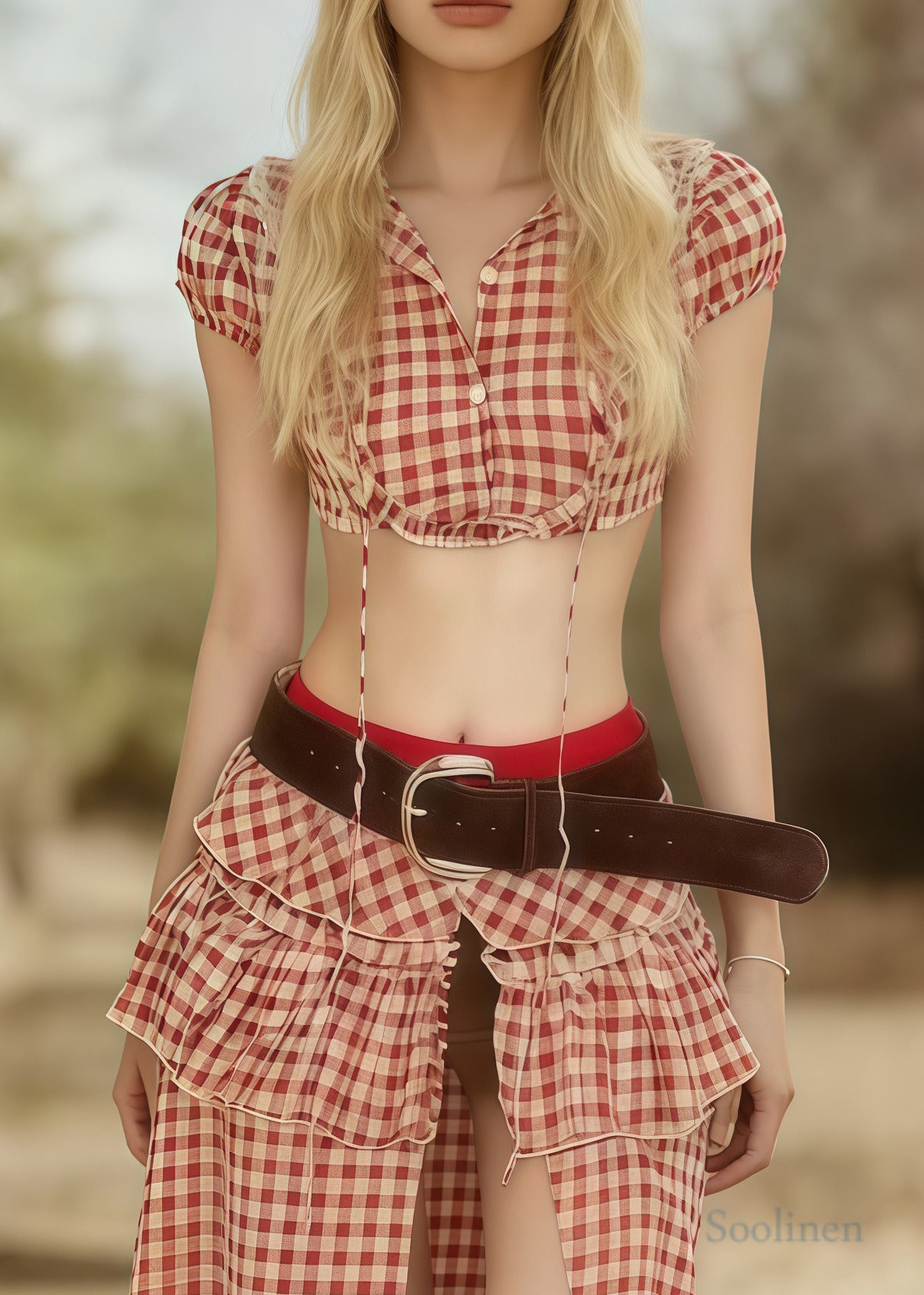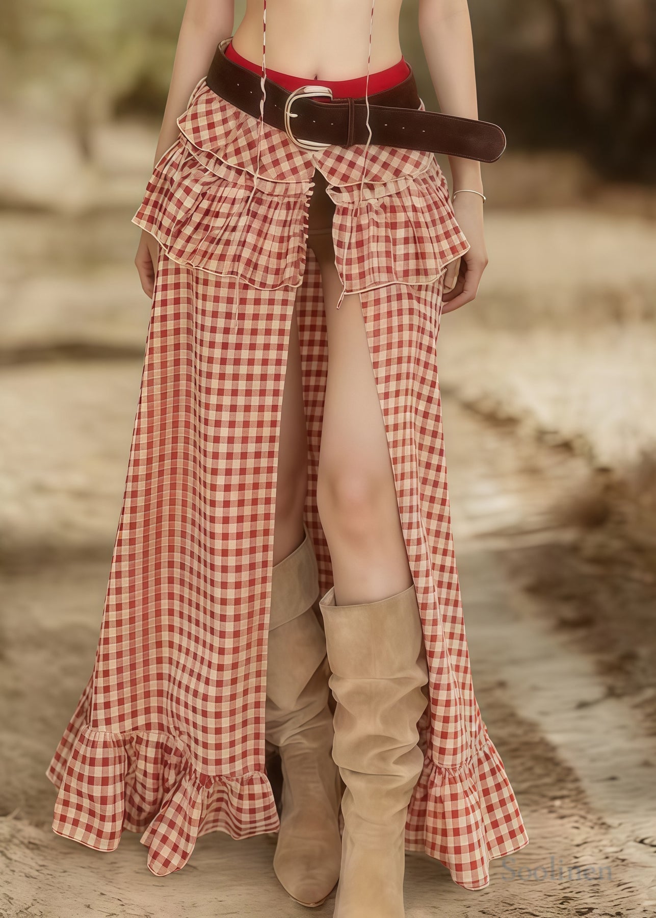 Bohemian Pink Plaid Side Open Cotton Two Pieces Set Summer