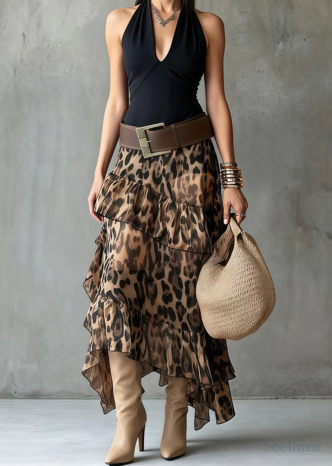 Brown Leopard Print Chiffon Holiday Skirt Ruffled Summer