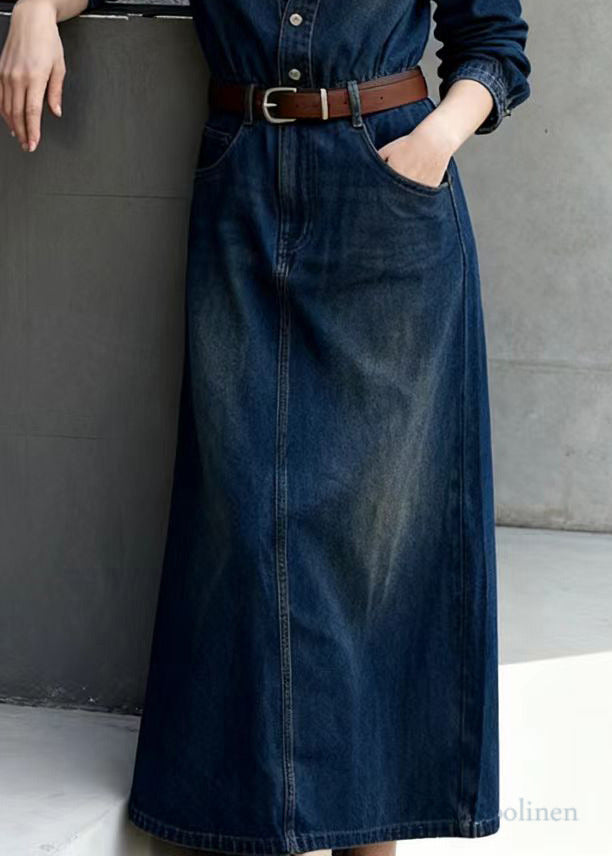 French Navy Peter Pan Collar Tie Waist Denim Long Dress Spring