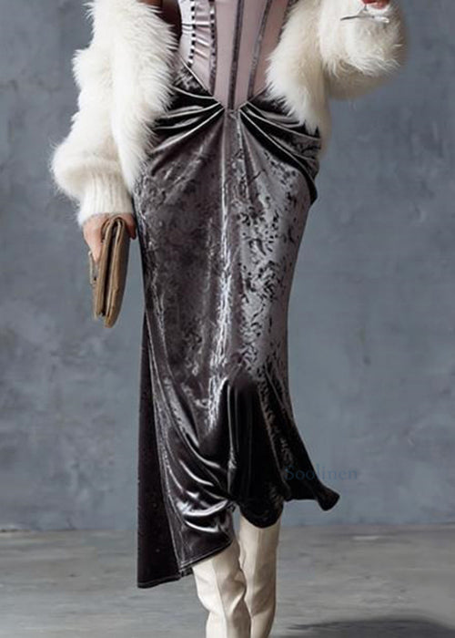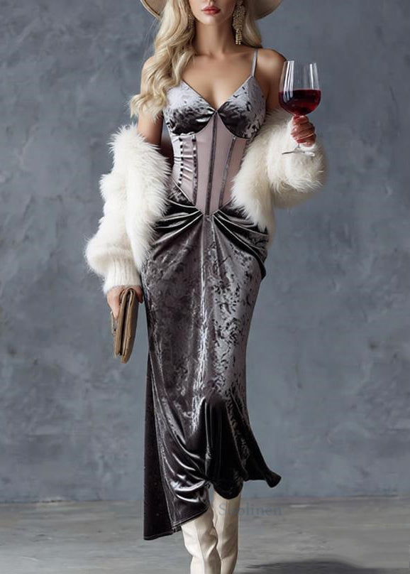 Slim Fit Grey Wrinkled Tulle Patchwork Spaghetti Strap Dress Sleeveless