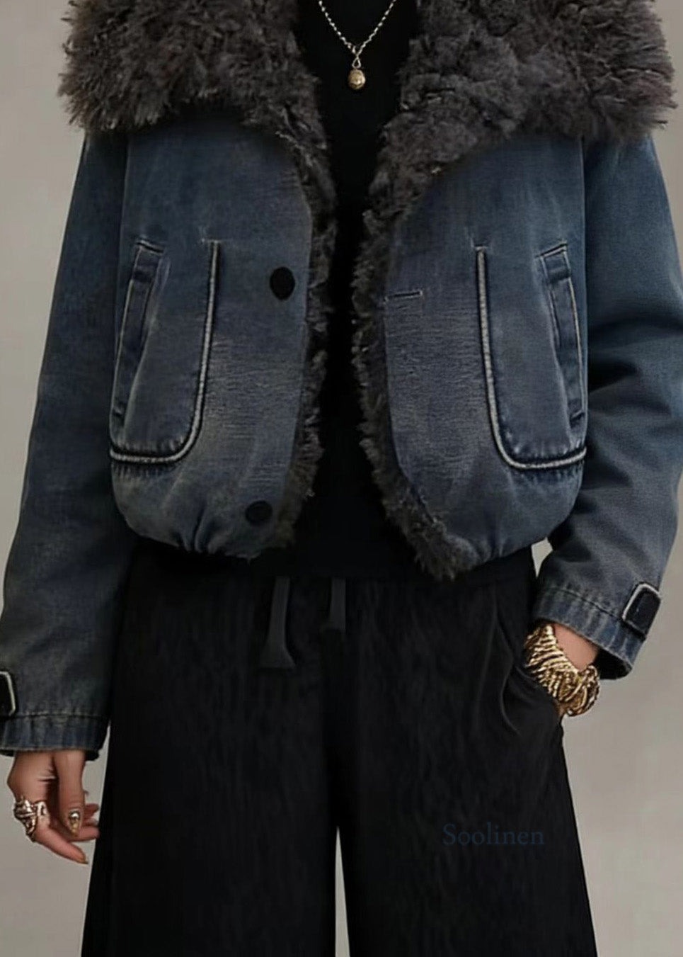 Stylish Blue Teddy Faux Fur Patchwork Fine Cotton Filled Jacket Winter