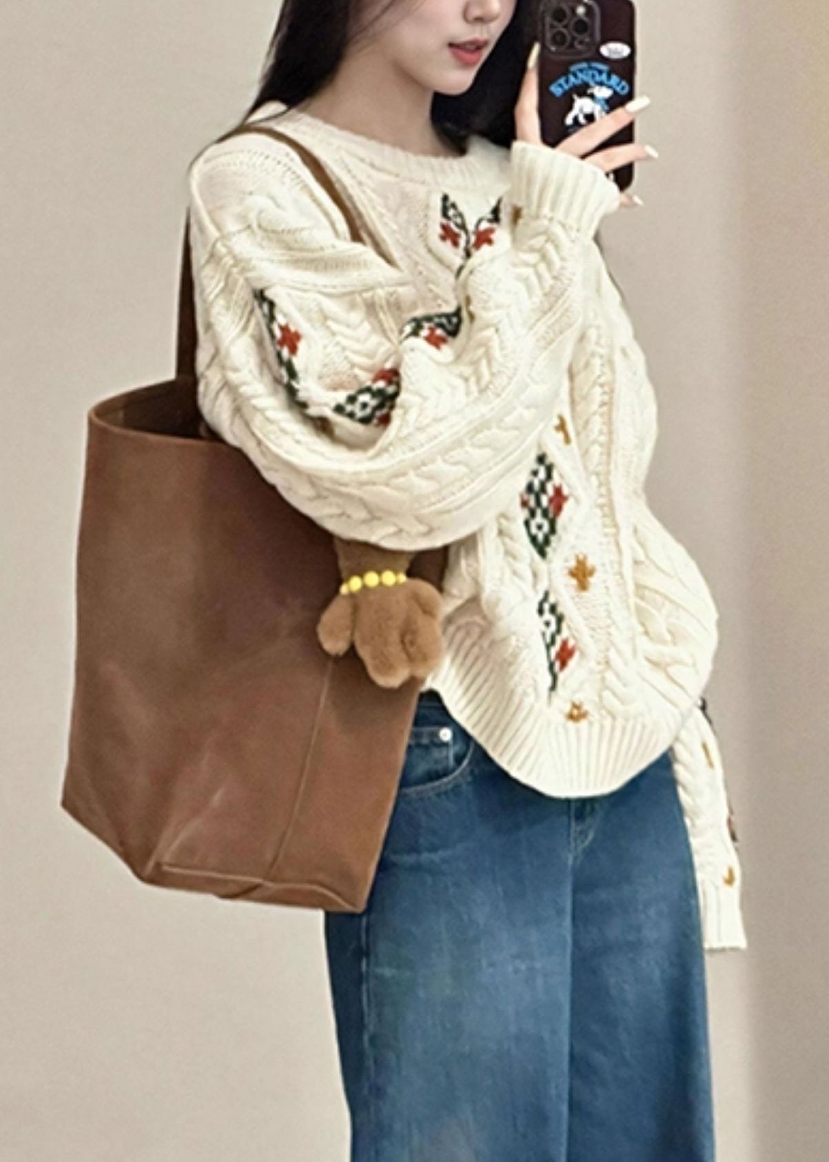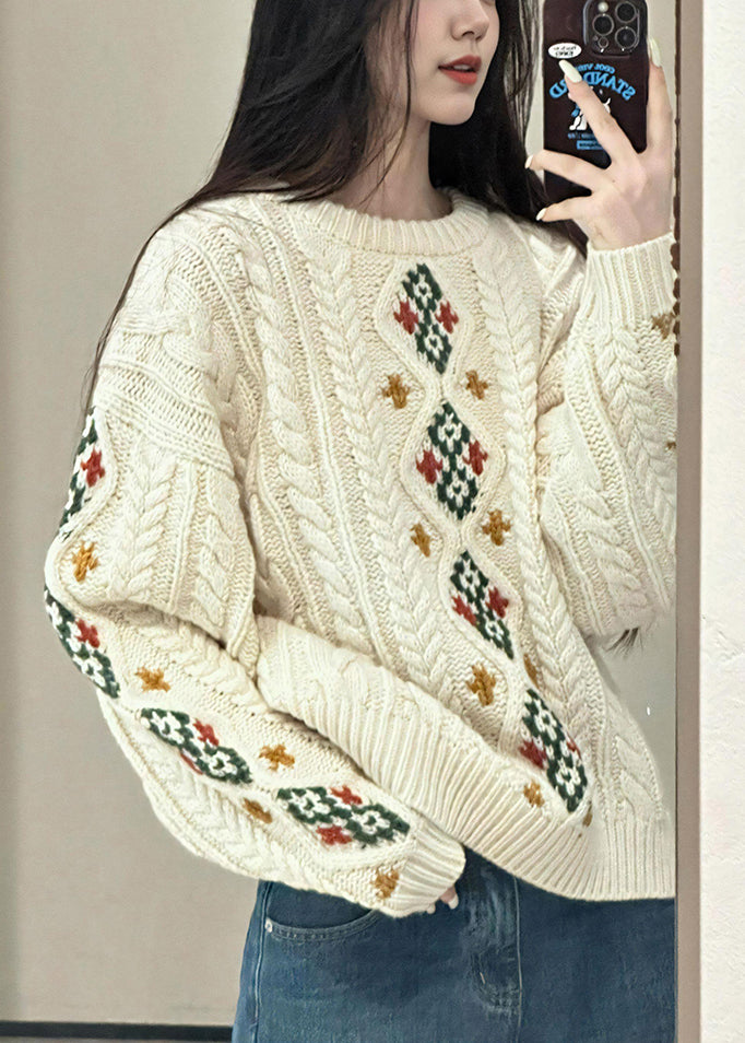 Loose Beige O Neck Plaid Cable Knitted Cotton Sweater Spring