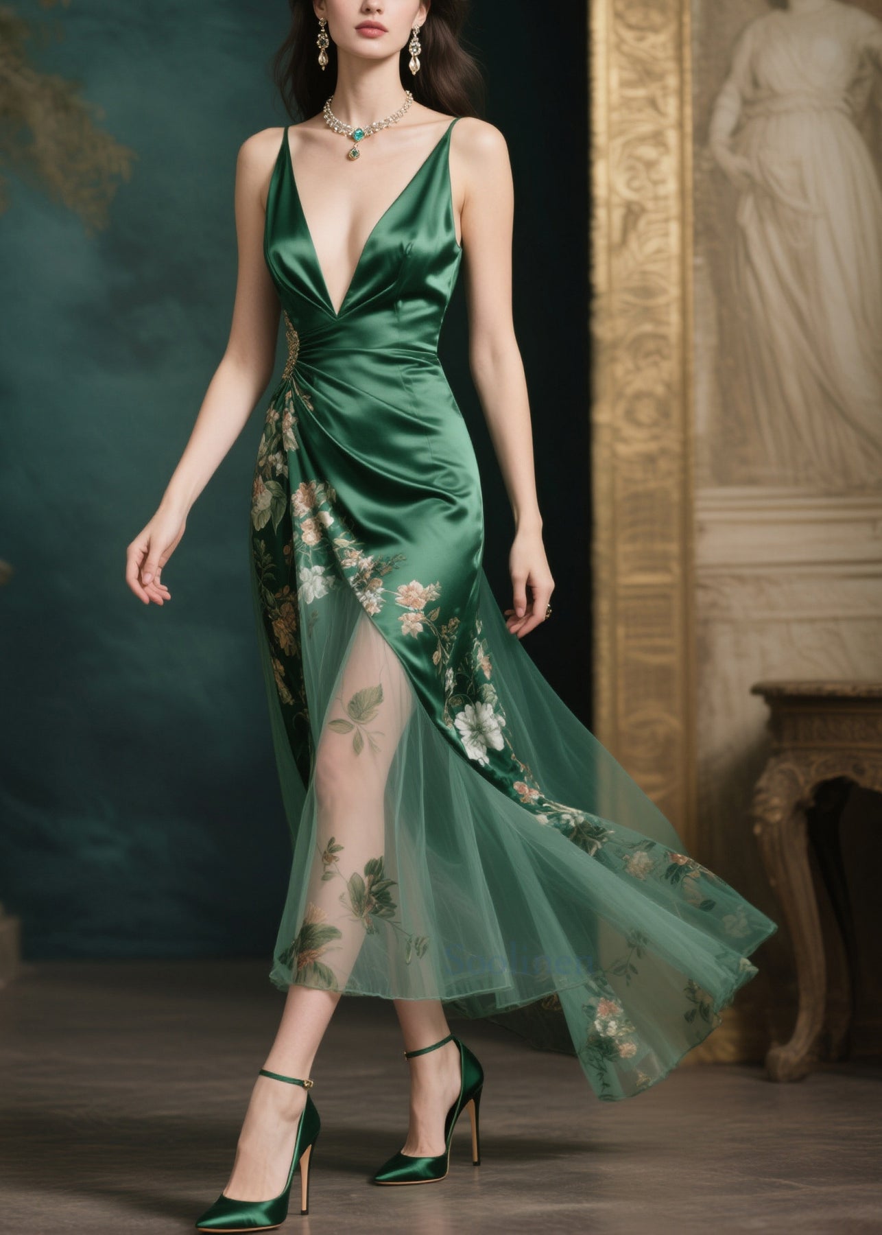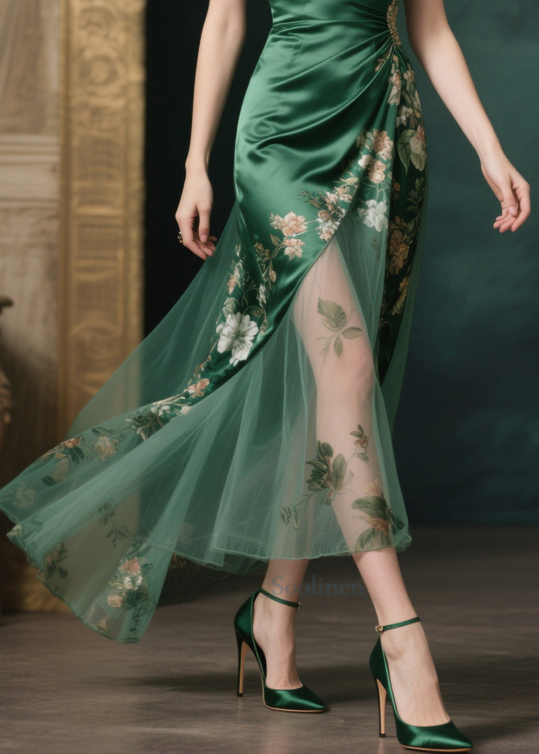 Silm Fit Tea Green Print Patchwork Tulle Party Dresses Summer