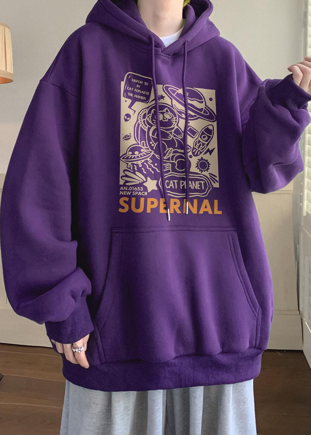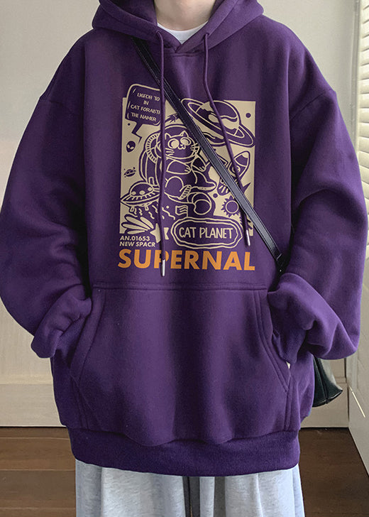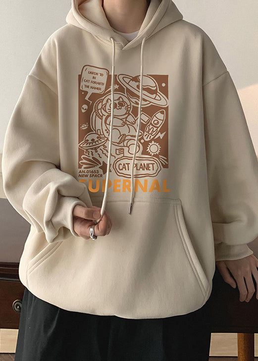 Casual Apricot Hooded Print Warm Fleece Men Sweatshirt Winter