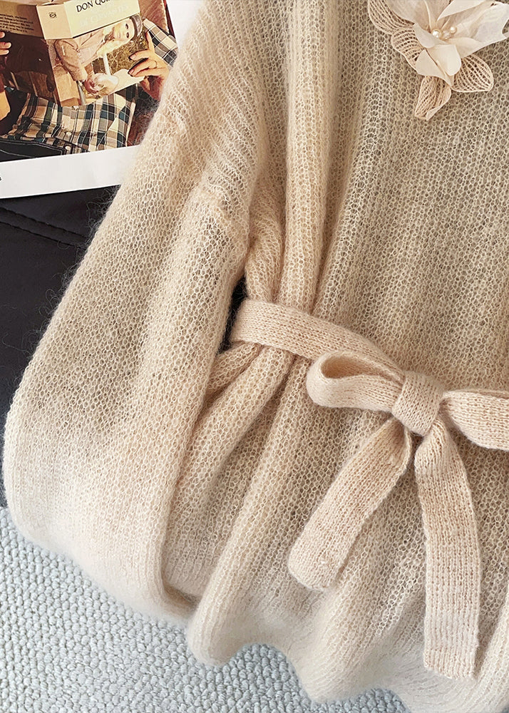 Fitted Khaki Tie Waist Floral Decorated Knit Sweater Tops Fall