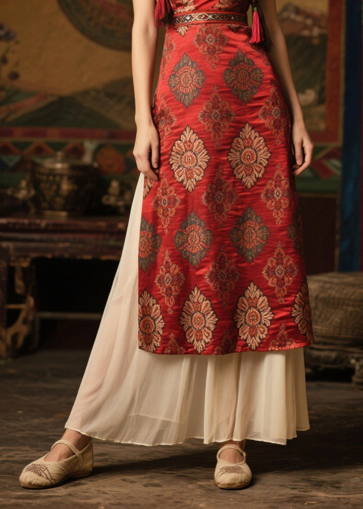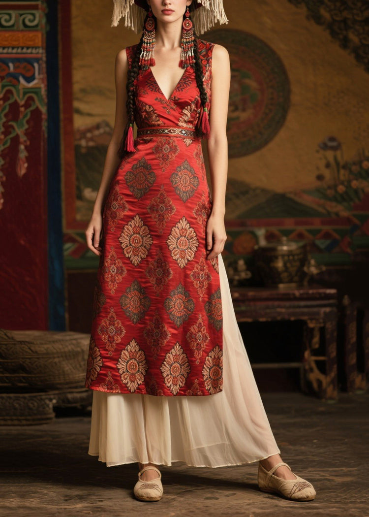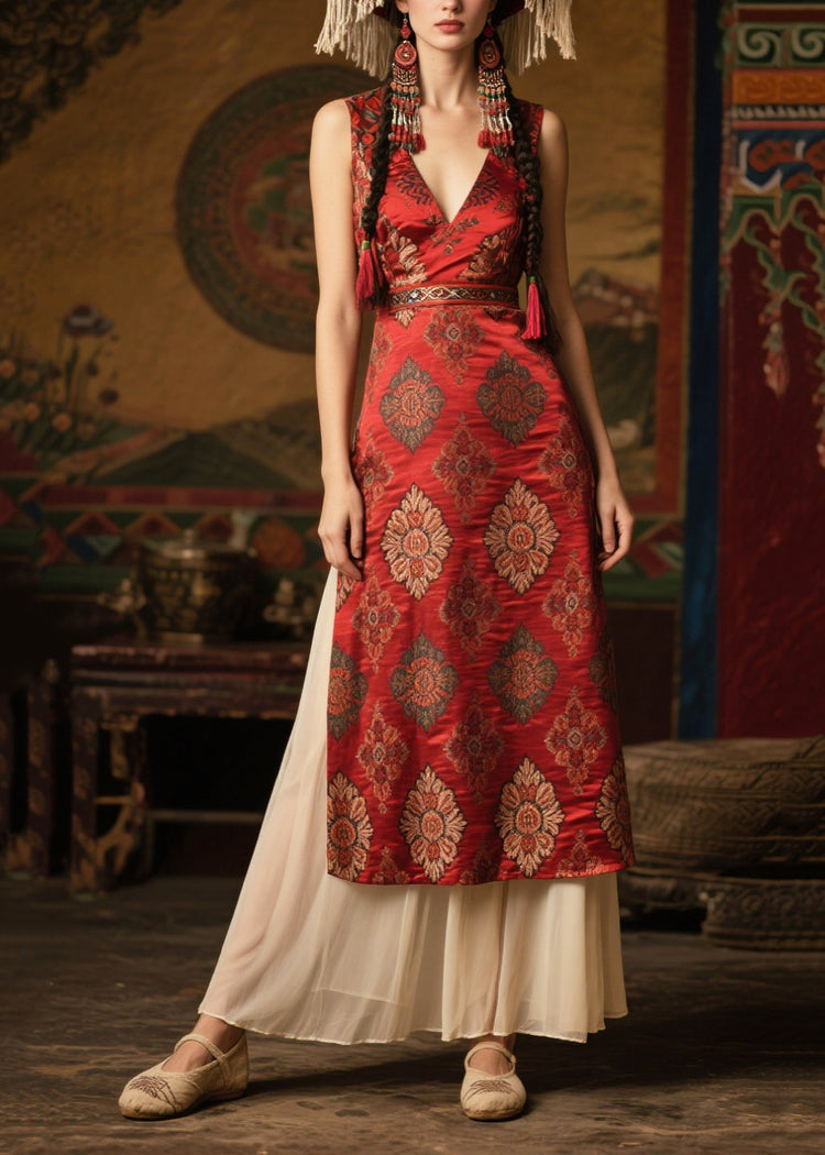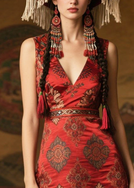Silm Fit Red Print Side Open Silk Dress Sleeveless