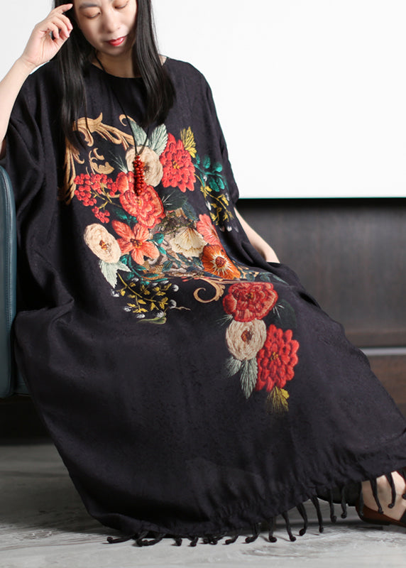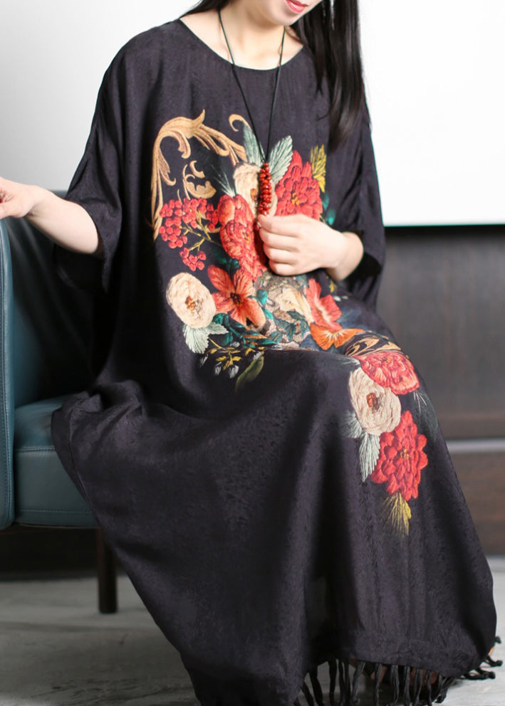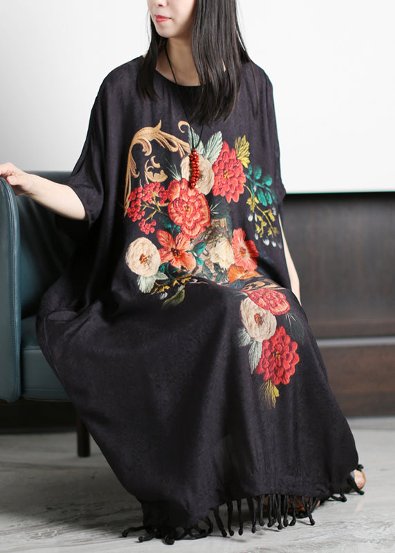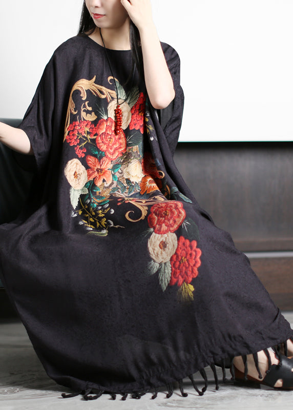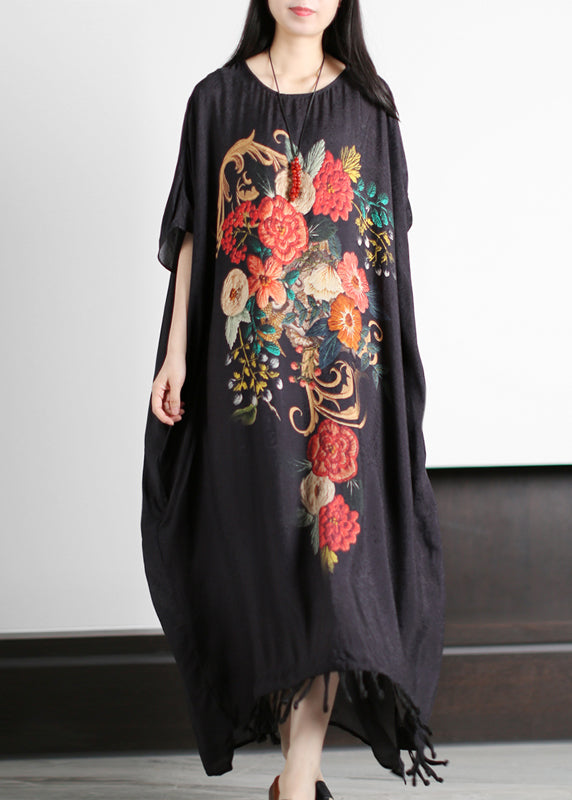 Chic Red Print O-Neck Quaste Silk Holiday Dress Short Sleeve