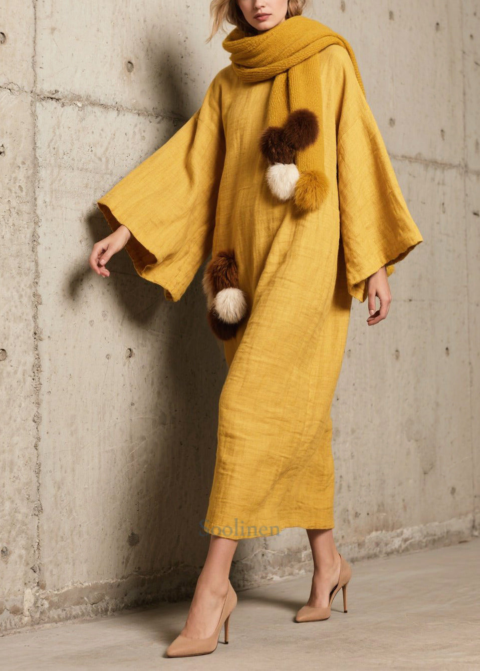 Unique Yellow Oversized Fuzzy Ball Decorated Cotton Long Dress Fall