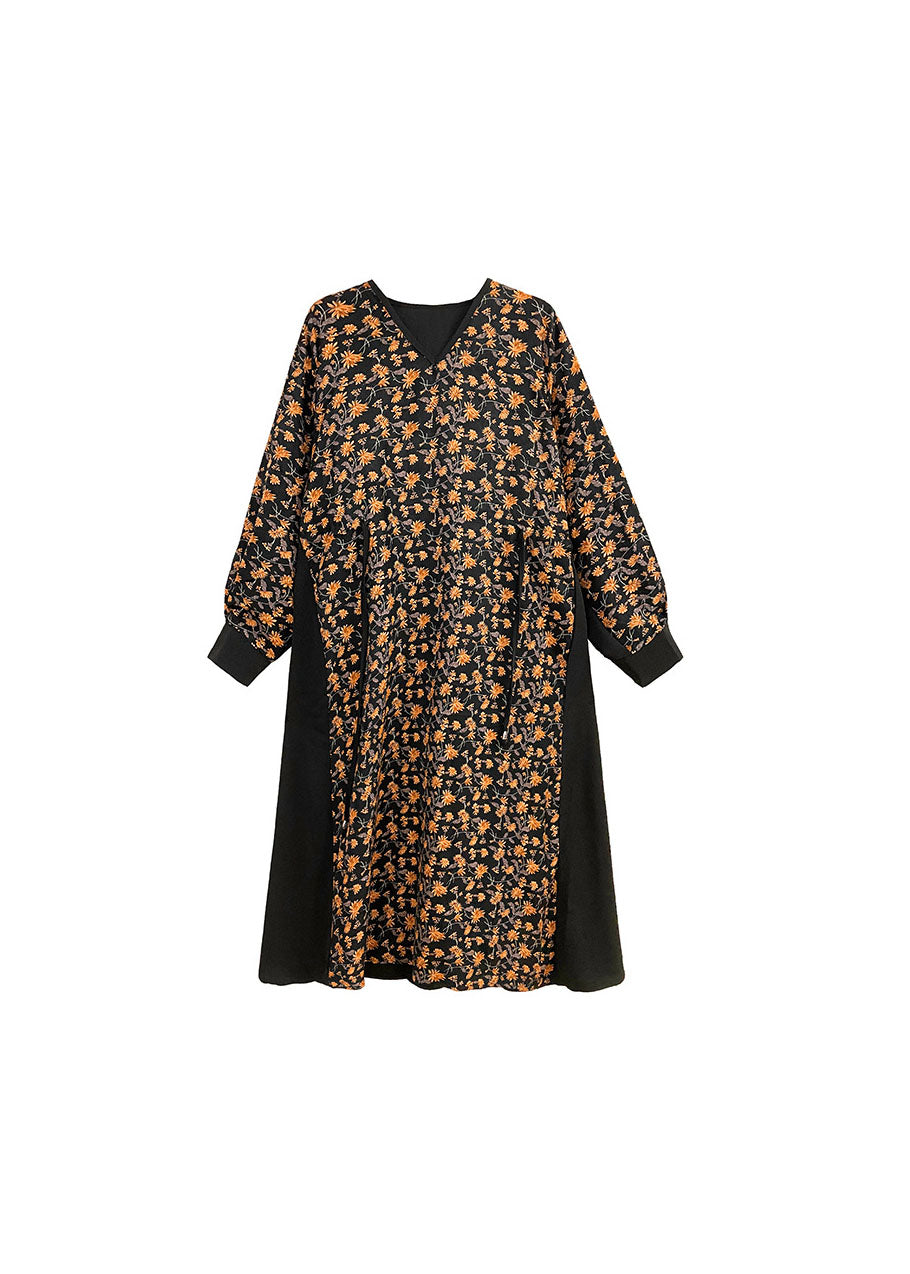 Plus Size Schwarze Taille mit V-Ausschnitt, Patchwork-Seide, Feiertagskleid, Frühling