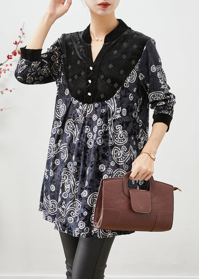 Boho Black V Neck Patchwork Print Silk Velour Long Shirt Fall
