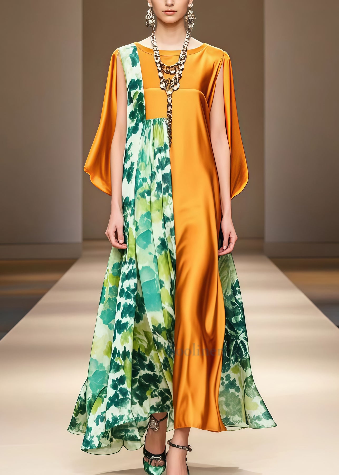Fitted Golden Asymmetrical Patchwork Print Silk Maxi Dress Summer